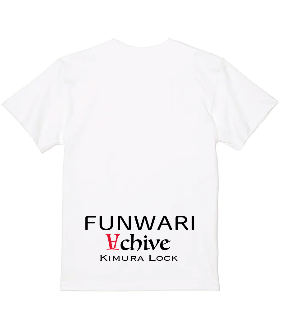 ◯バックの腰あたりに【FUNWARI ACHIVE】をデザインしてみました。丸ゴシックなフォントでFUNWARIの雰囲気を出しています。一方でACHIVEはカチッとしたフォントを使っています。ACHIVEのAはあえて逆さまにして、V字達成の願いを込めました。[KIMURA LOCK]もしっかり刻みました。