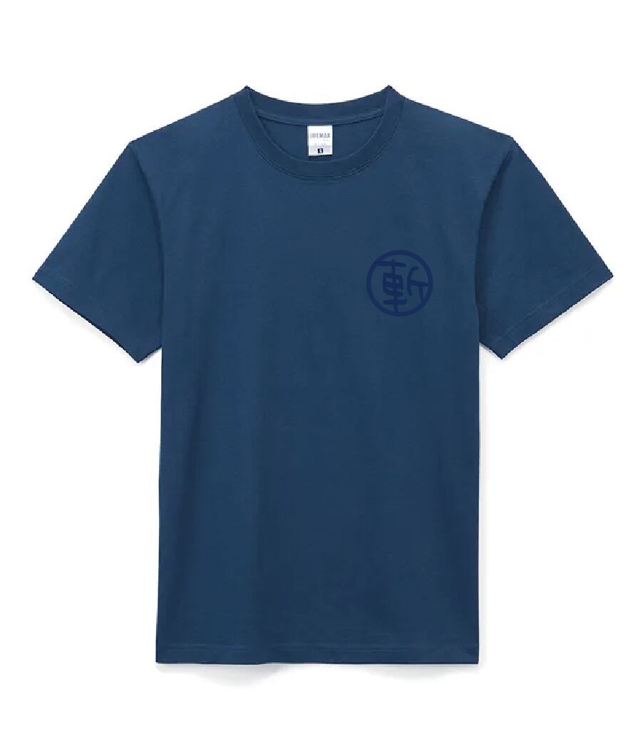 ◯フロント:左胸に「丸に斬」のロゴを配置しています。ネイビー地のTシャツにプリントシートもネイビーでさりげなくプリントしています。